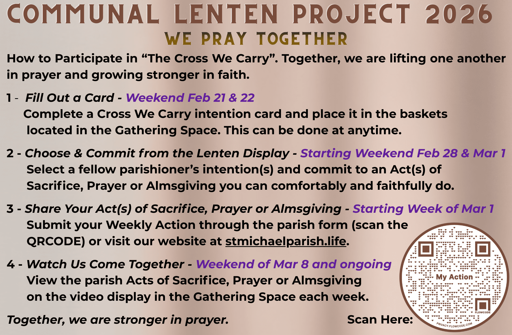 St. Michael Parish is a welcoming community that offers many ministries, opportunities to grow in faith, and beautiful spaces to experience the light of Christ. Our mission is to deepen our relationship with God by sharing the power of prayer, compassion, and healing with our brothers and sisters. We aim to create an environment that fosters: