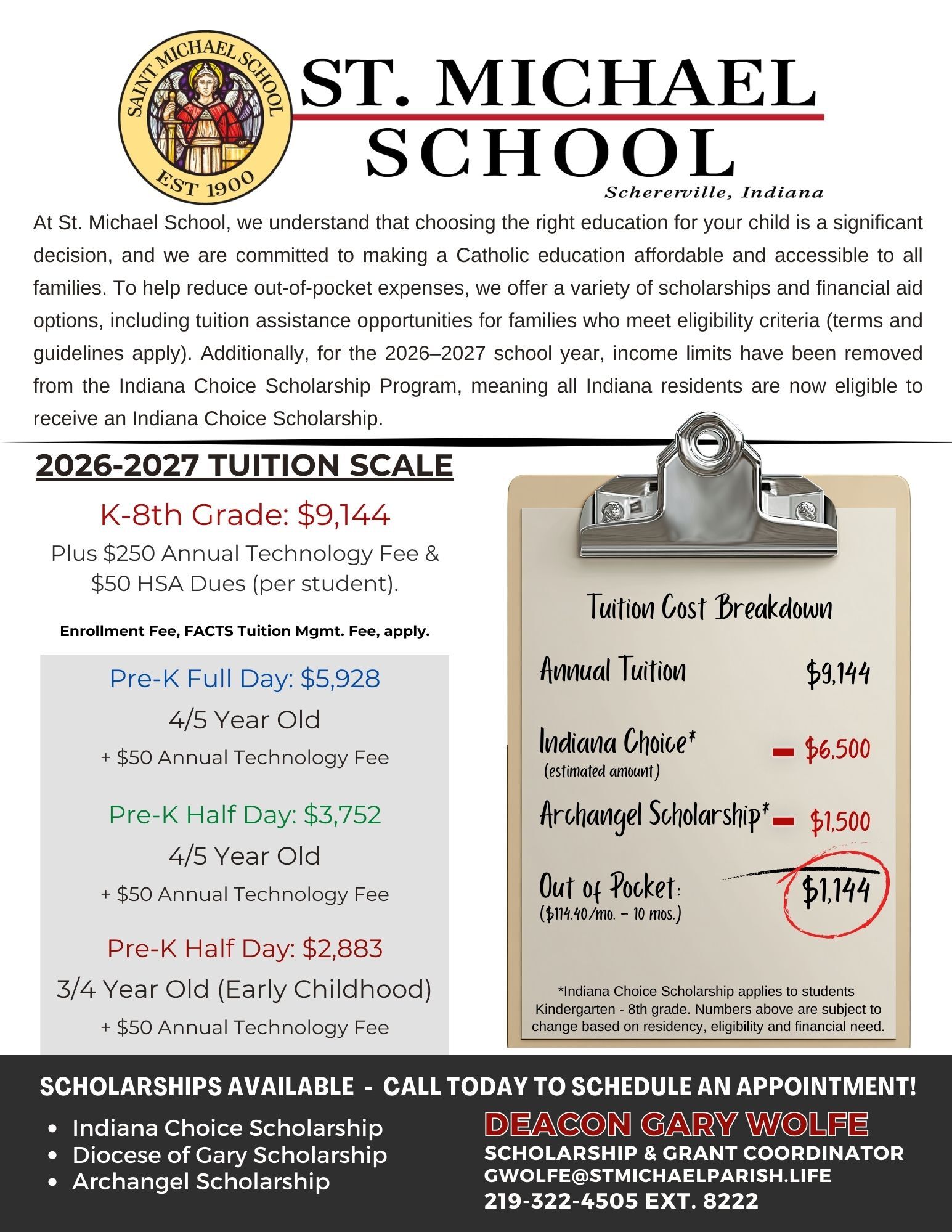 Tuition St. Michael the Archangel Scholarship 2026 Details To find out if you qualify for financial aid options please contact our Scholarship & Grant Coordinator, Deacon Gary Wolfe, gwolfe@stmichaelparish.life / 219-322-4505 ext. 8222